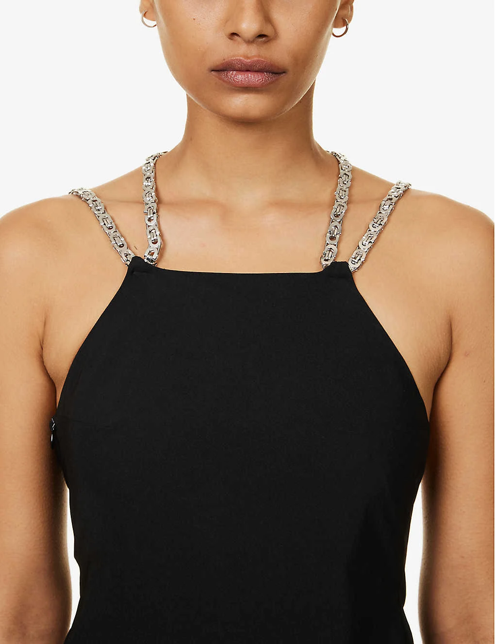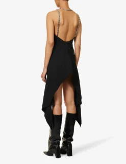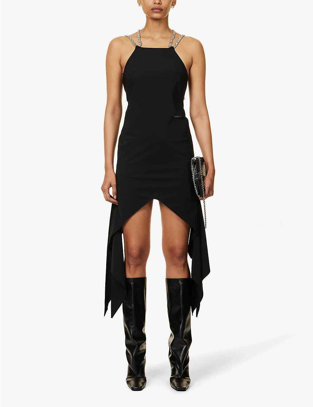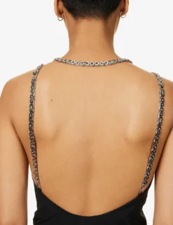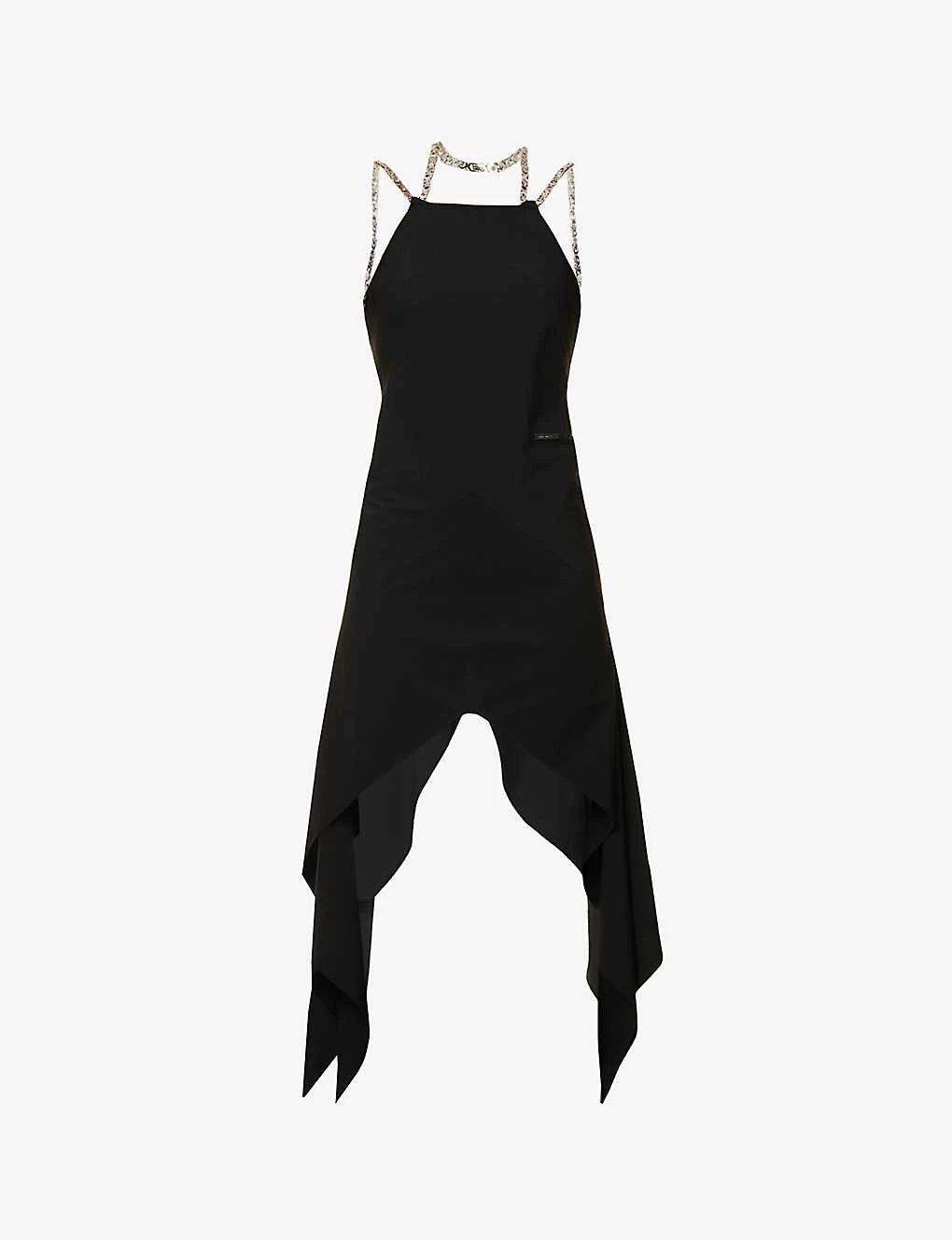 - Regular fit, halterneck, sleeveless, chain straps, brand metal panelled pattern, draped panels at sides, flared asymmetric hem