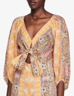 - V-neck, three-quarter-length-sleeves, front tie detail, cut-out at front, wide leg, all-over floral print