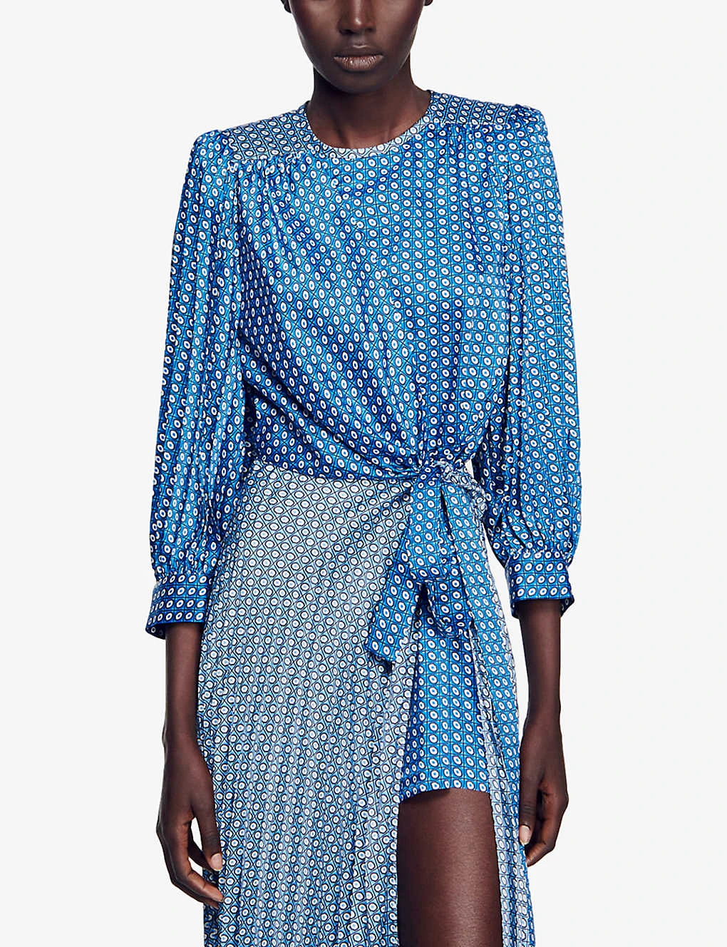 - Round neckline, puffed shoulders, long sleeves, under shorts, overlay asymmetrical panelled skirt, adjustable waist belt, all-over graphic print
