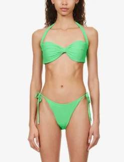 - Sweetheart silhouette, halterneck strap, pinched bow design at front, padded, removable pads, gold-toned hardware