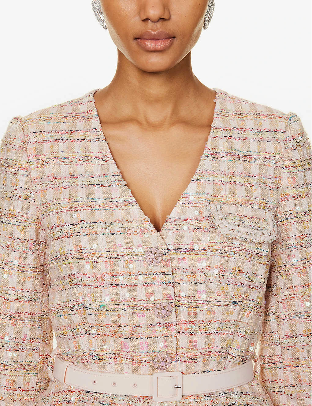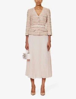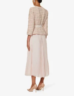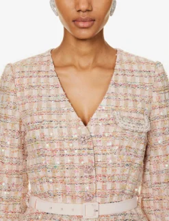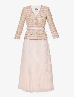 - Regular fit, V-neckline, padded shoulders, long sleeves, four flap pockets at front, tweed texture upper with metallic thread weave, embellished buttons, detachable belt, pleated flared hem, lined