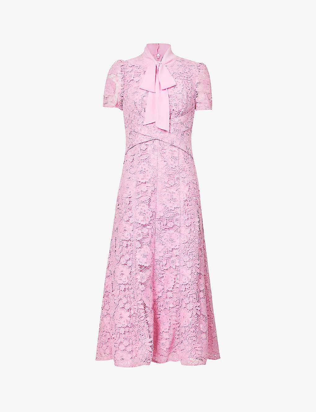 - Regular fit, V-neckline, self-tie panels at neck, short puff sleeves, structured waist, floral lace pattern. flared hem, partially lined