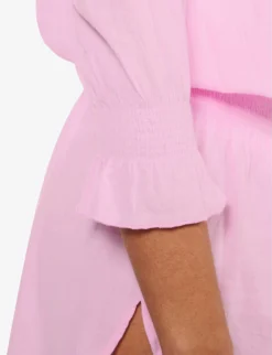 - Regular-fit, V-neck, collarless, three-quarter-length sleeves, flared cuffs, elasticated drawstring waistband, smocked trims, curved hem