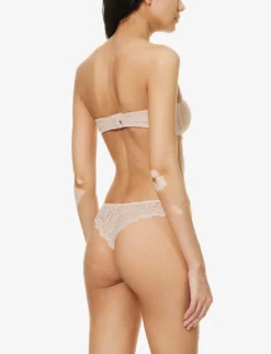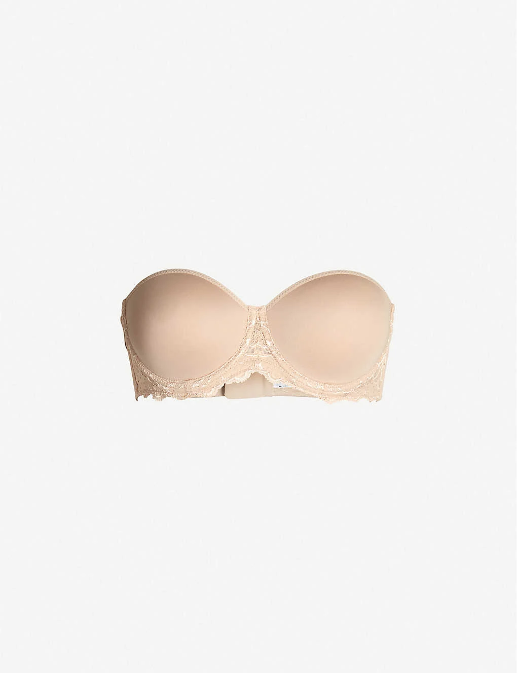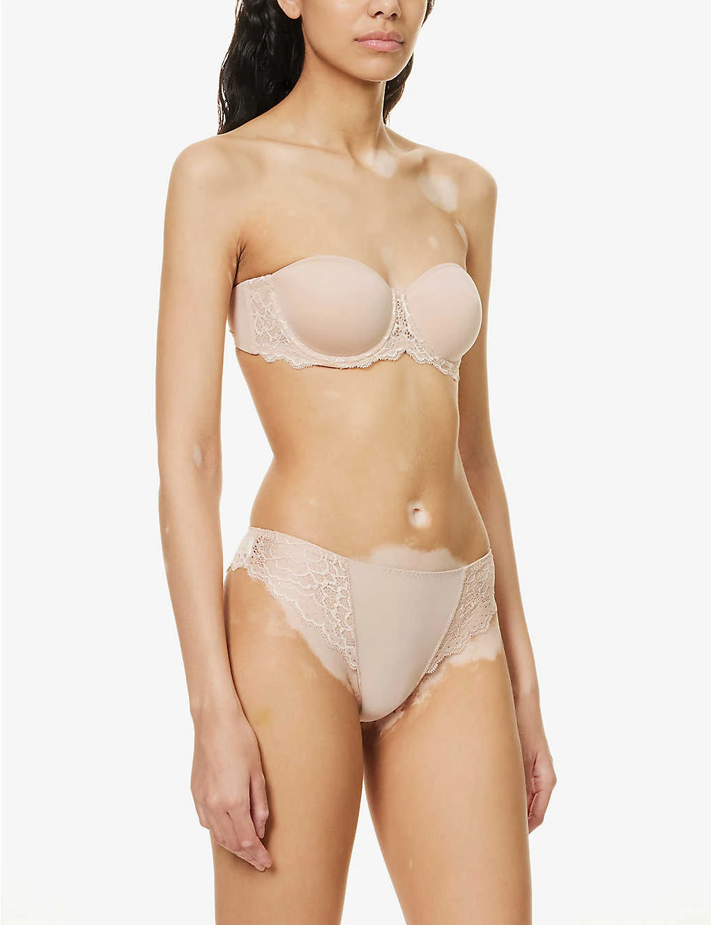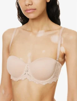 - Half-cup, strapless, detachable straps, soft molded cups, underwired, lace trims, medium support