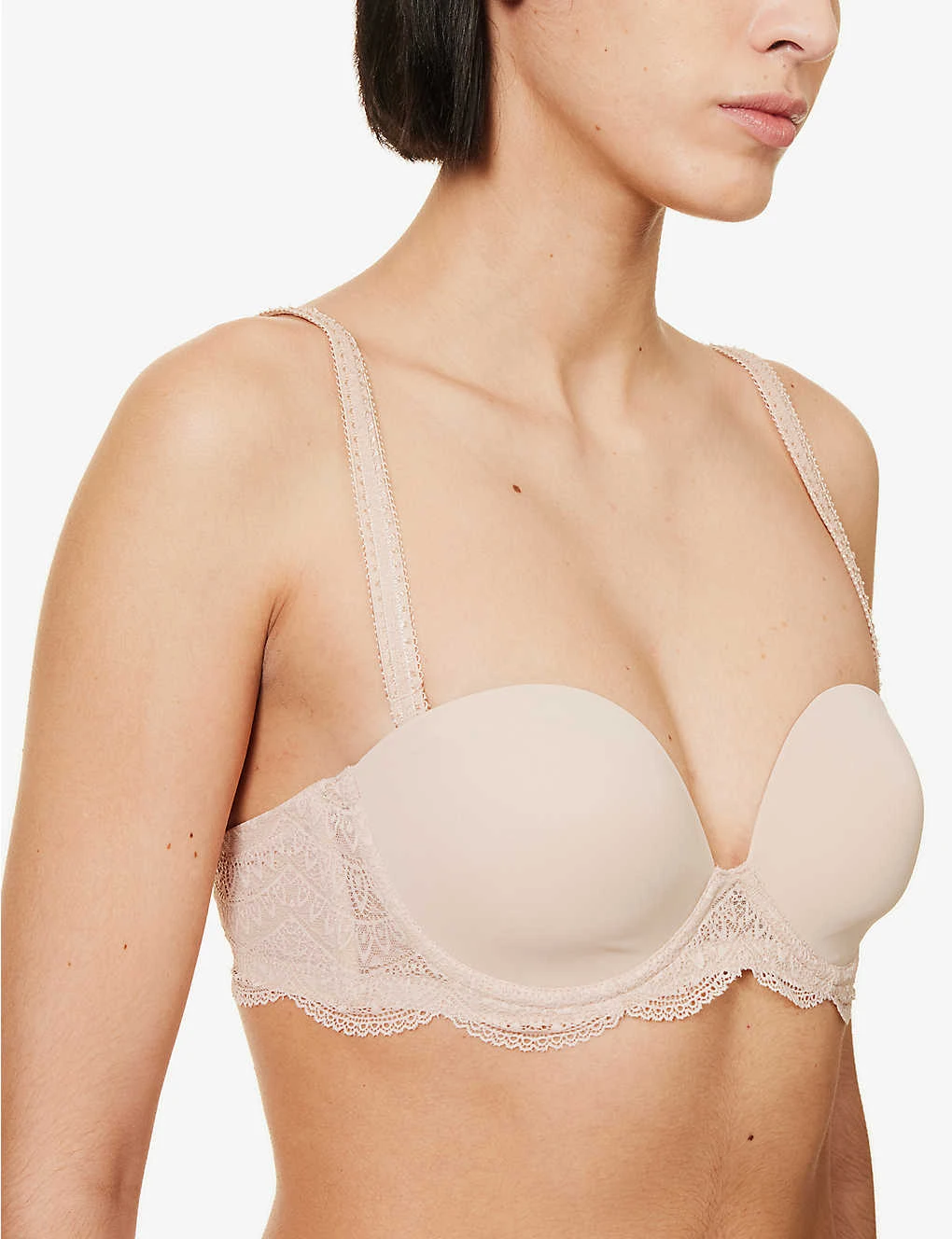 - Plunge cup, detachable adjustable straps, multi-way design, underwired, molded cups, lace wings, scallop trims, medium support