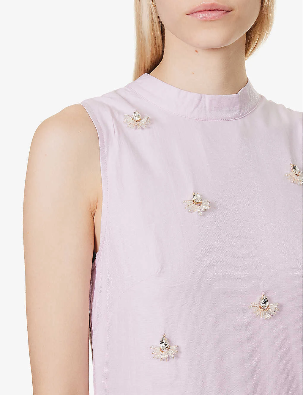 - Relaxed fit, H-line silhouette, round neck, sleeveless, all over rhinestone embellishment, fully lined, straight hem