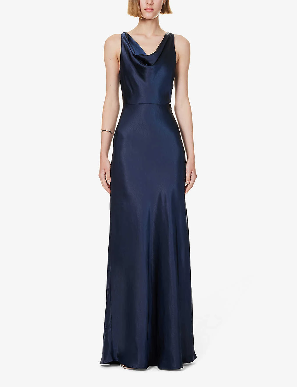 - Slim fit, cowl neckline, sleeveless, darts at back, all over satin texture, flared hem