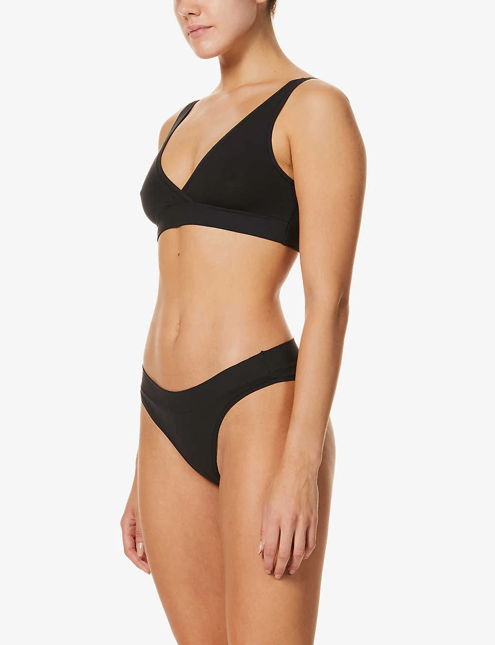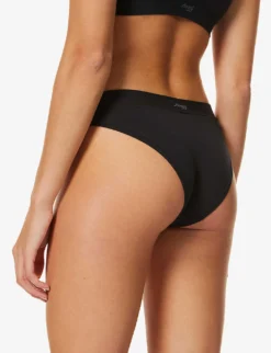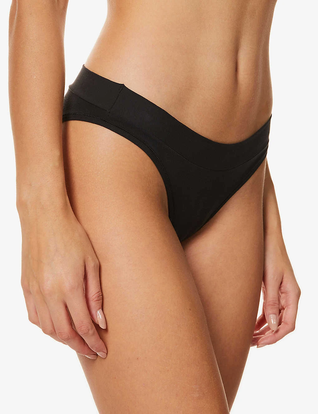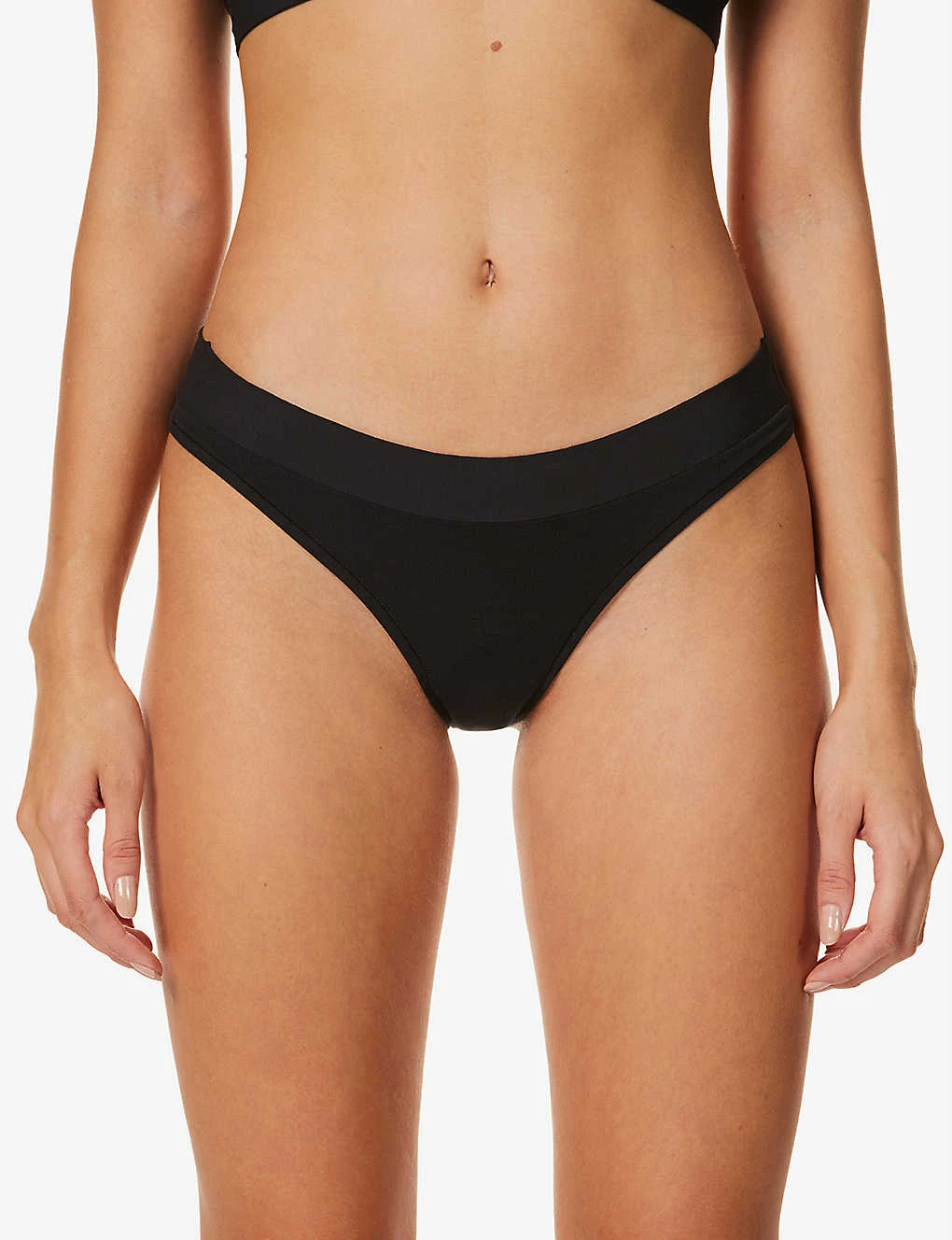 - Mid-rise, elasticated waistband, all-over woven texture, exposed seams, full-coverage at back