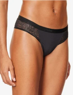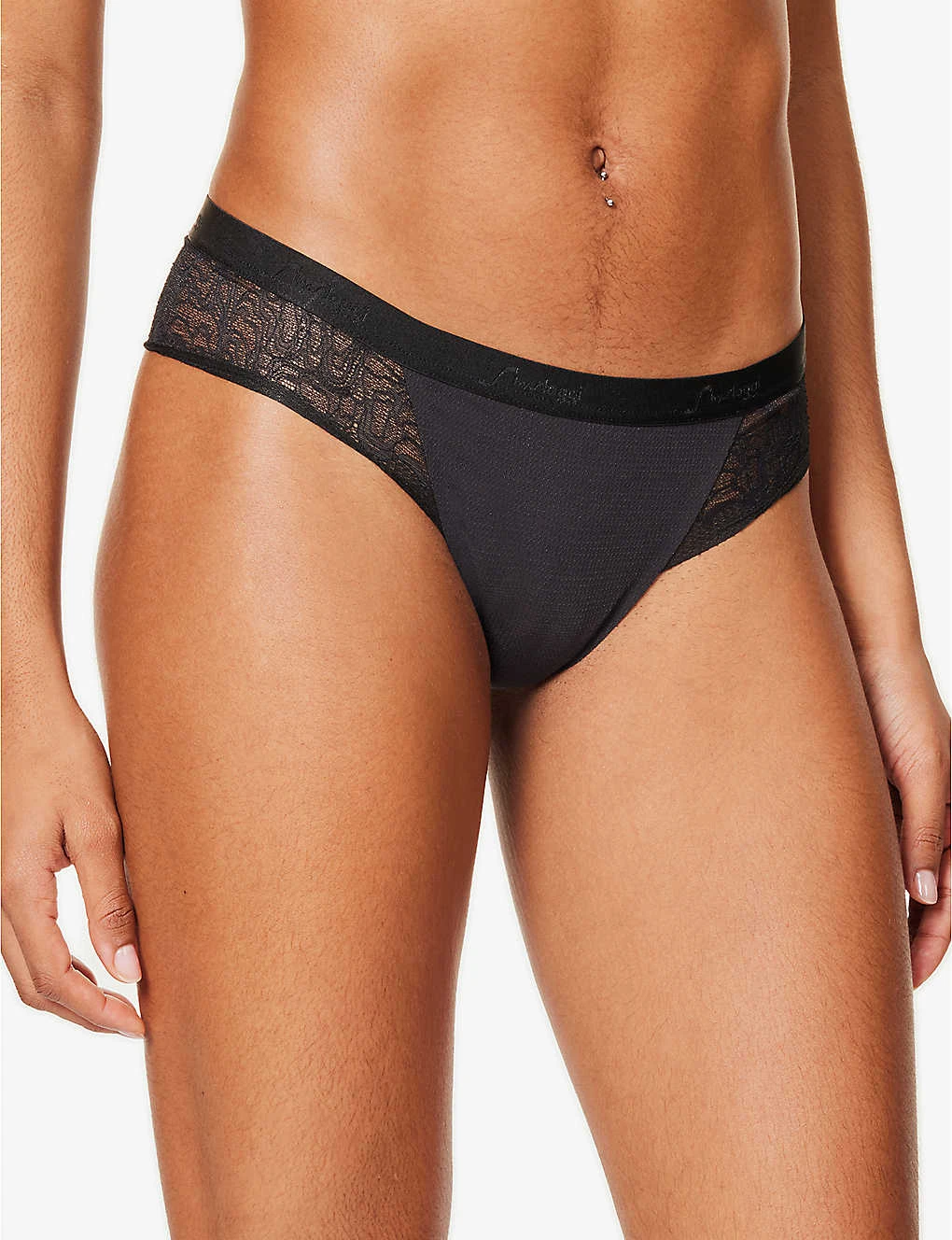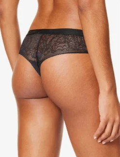 - Mid-rise, branded elasticated waistband, all-over semi-sheer lace, contrast panel at back and gusset, lined gusset, low coverage at back