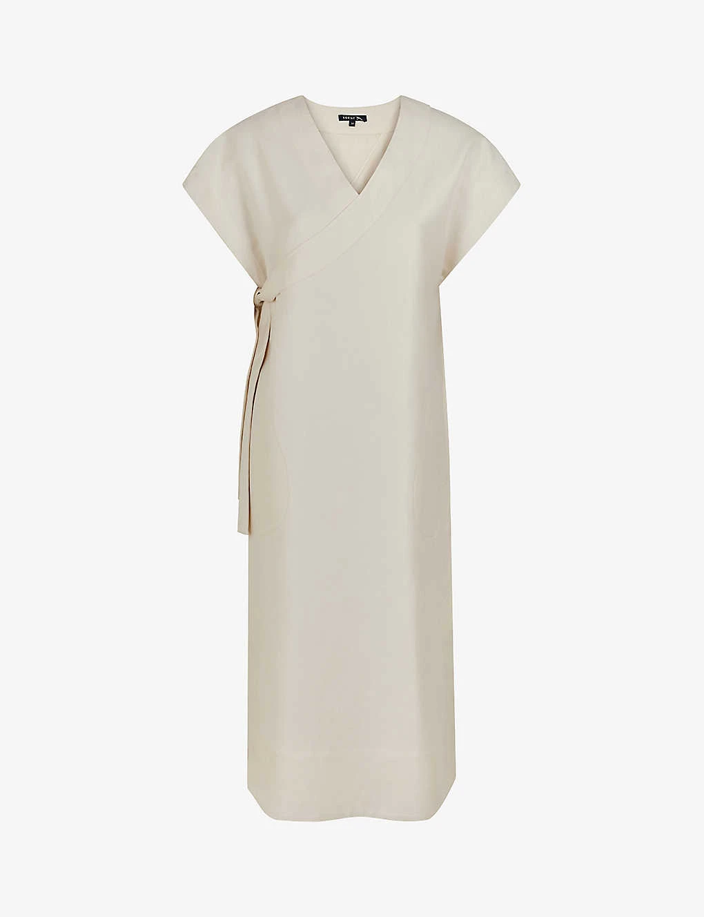 - Relaxed fit, short sleeves, V neck, wrap design, side tie fastening, kimono style, midi length, side slits, straight hem