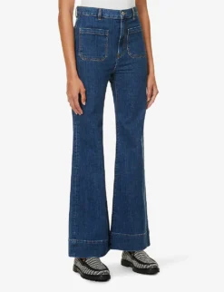 - Regular fit, high rise, flared leg, belt loops, contrast stitching, two patch pockets at front, darts at back, two patch pockets at back, brand patch at back