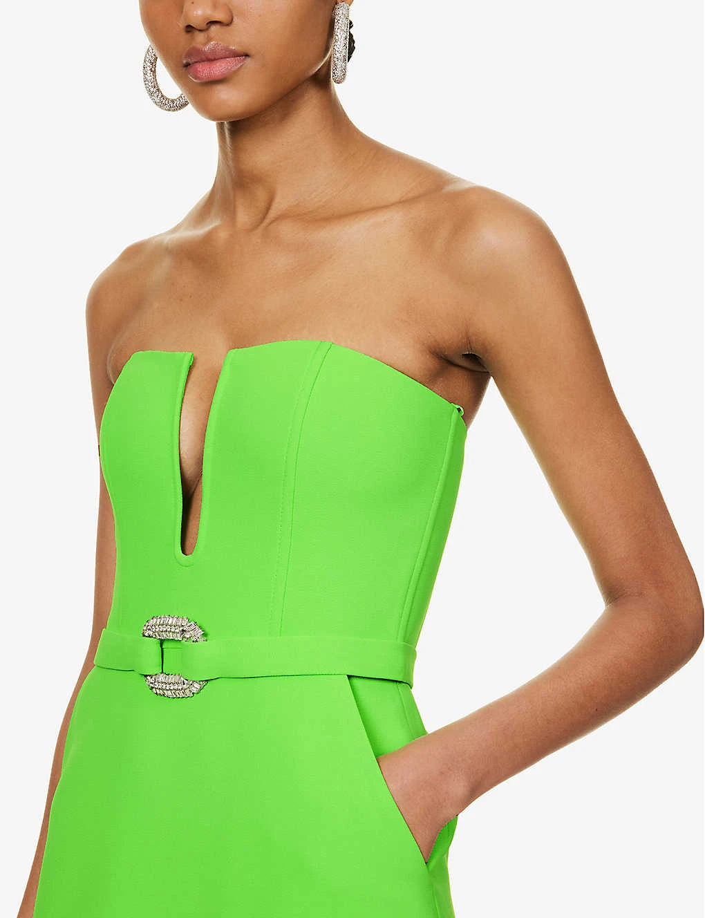 - Slim fit, semi-sweetheart neckline, strapless, corset bodice, belt at waist with embellished buckle, two slip pockets at front, split at back, crepe texture, lined