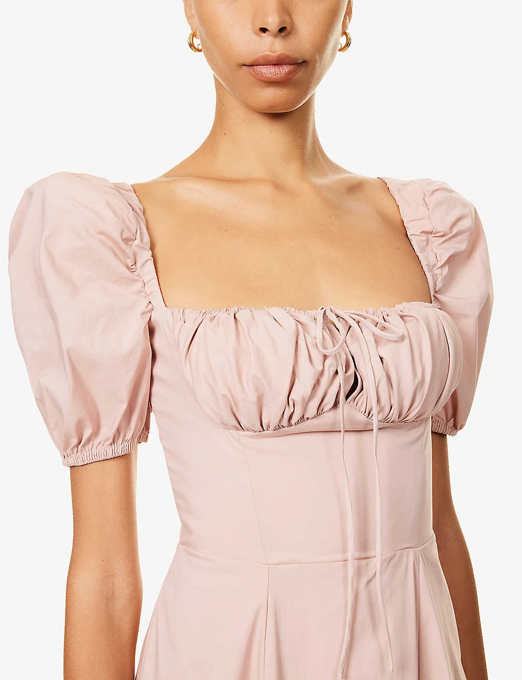 - Slim fit, semi-sweetheart neck, elasticated trim at neckline, short puffed sleeves, elasticated sleeve hems, corset bodice, keyhole with self-tie at front, split at front, flared hem, fully lined