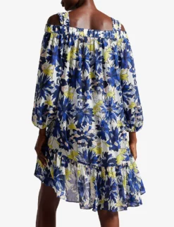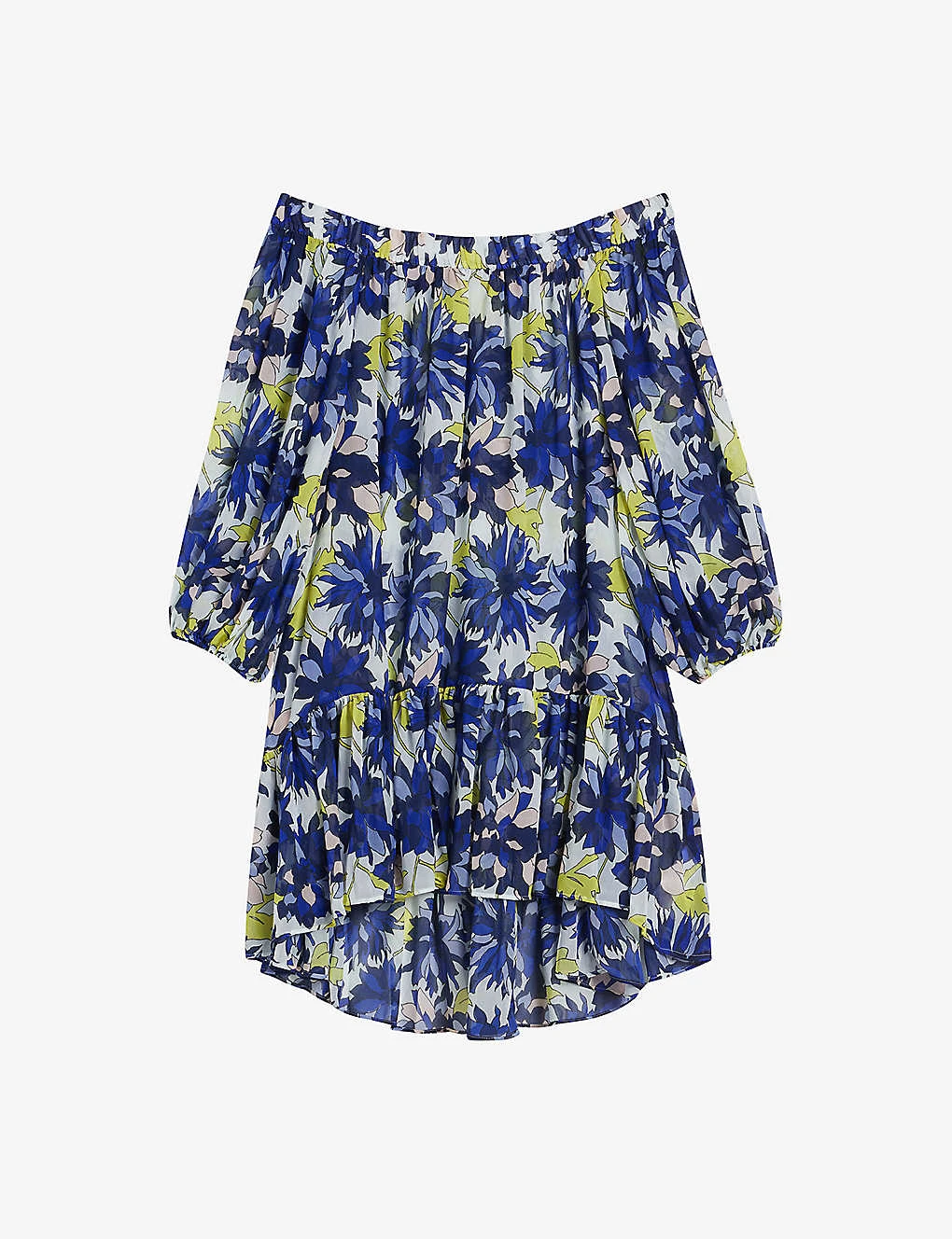 - Elasticated off-the-shoulder neckline, ruffle-trim shoulder straps, long blouson sleeves, tiered hemline, all-over semi sheer fabrication, all-over floral print, unlined