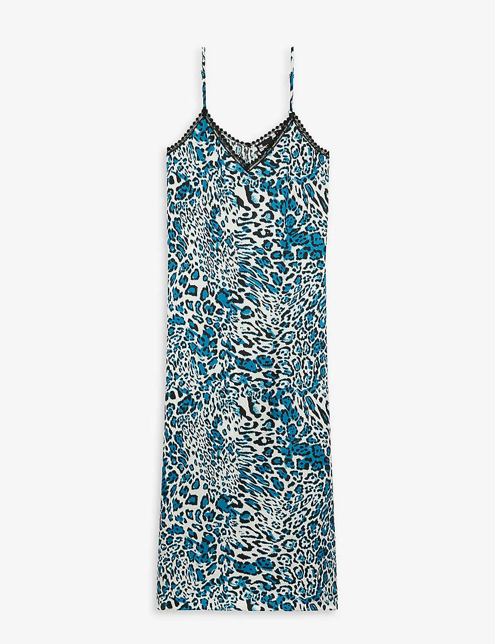 - V-neck, spaghetti straps, lace trim at neckline, all-over leopard print, slip silhouette, midi length