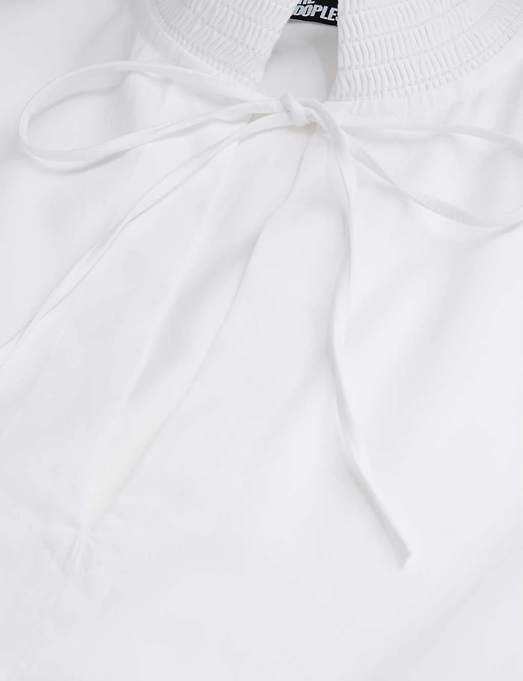 - High ruched neck, self-tie a the neckline, long sleeves, elasticated cuffs, openwork and broderie anglaise details, scalloped trim
