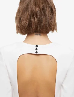 - Round neck, long sleeves, darts at front, exposed button fastening at back neck, cut out back design, ruffled hem panel