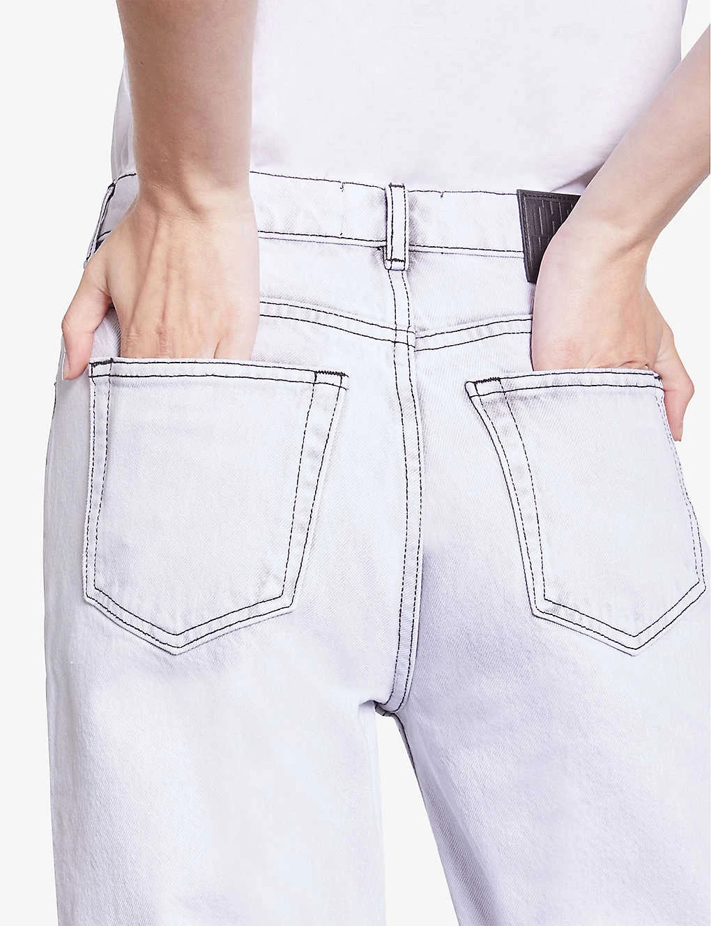 - Regular fit, mid-rise, straight leg, all-over faded wash, belt loops, five pocket design, logo patch, cropped, raw hems