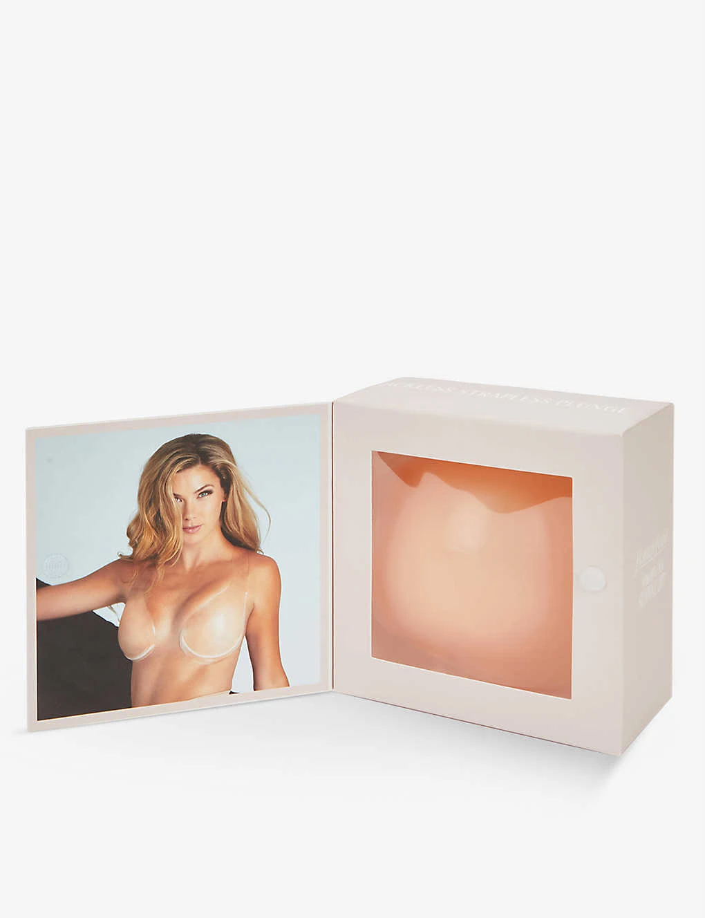 - Backless, strapless, lift-up tabs at top, moulded cups, adhesive backing