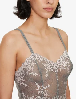 - Regular-fit, V-neck, adjustable shoulder straps, all-over floral lace embroidery, semi-sheer, scalloped trims