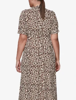 - V-neck, ruffled neckline, short sleeves, relaxed fit, all-over leopard print, midi length