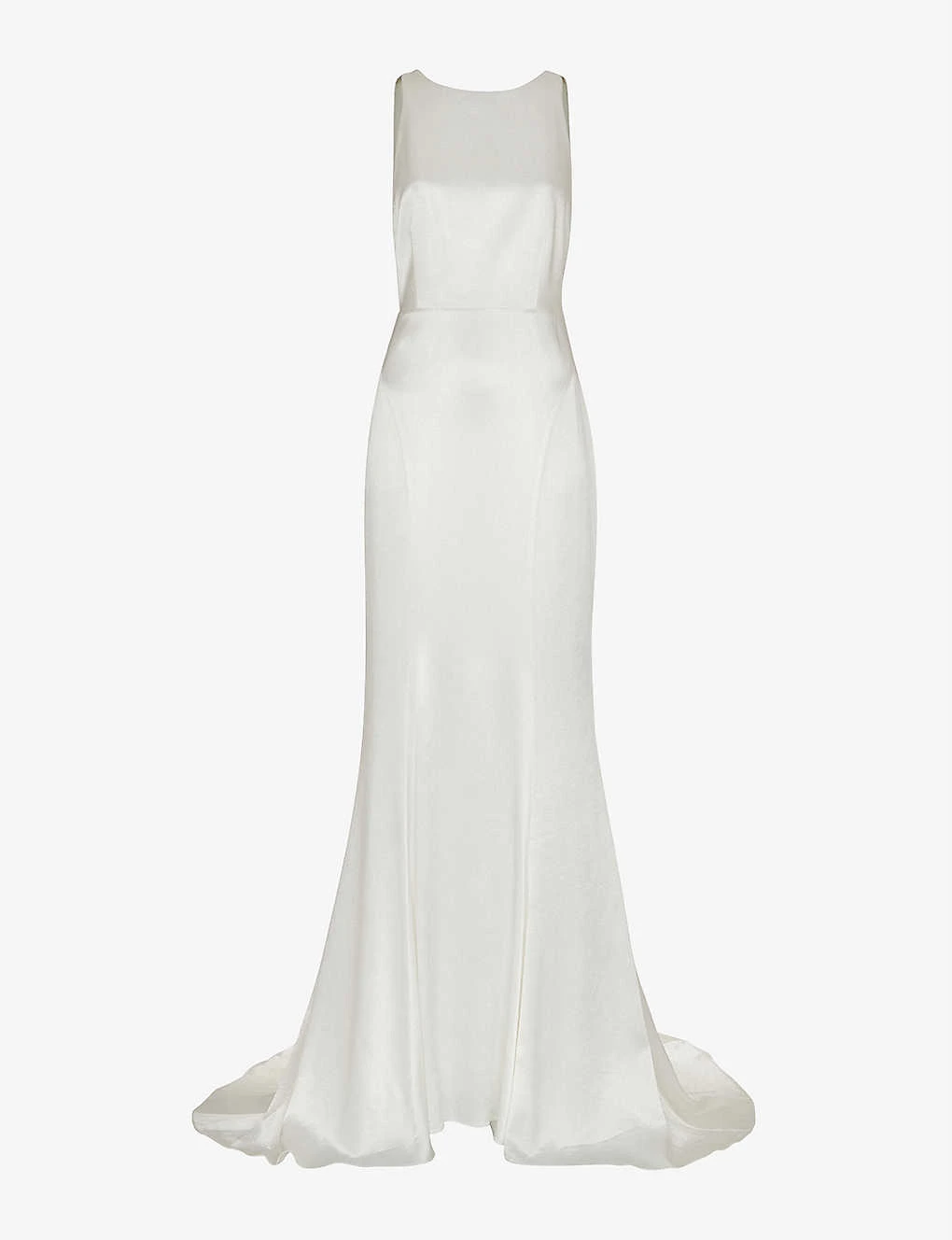 - Slim fit, high neck, sleeveless, all-over satin finish, fitted body, flared skirt from knee to hem, low back, straps to the back, floor length, curved train
