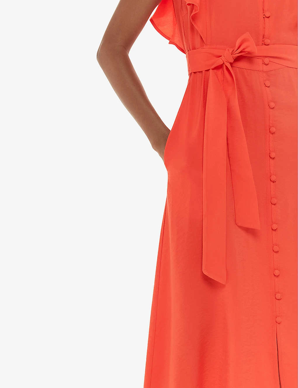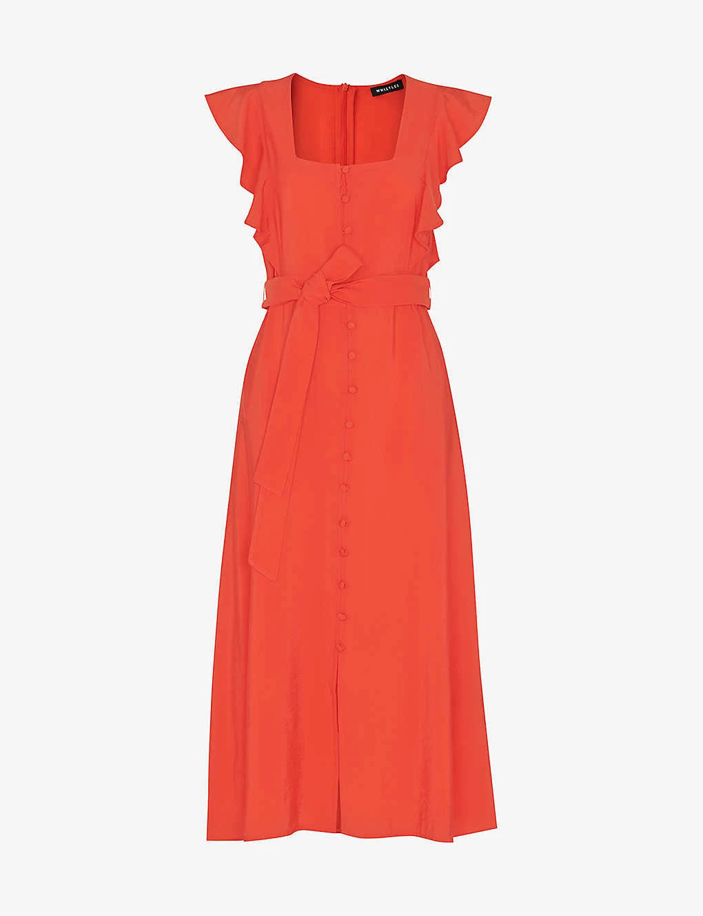 - Square neck, frill-sleeve, button-down fastening at the centre, self-tie belt at the waist, midi length