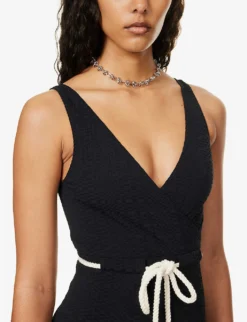 - V-neckline, wrap-over pattern, chunky drawstring at waist, all-over textured pattern, high leg