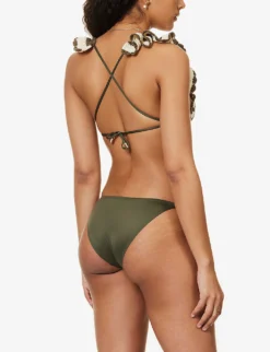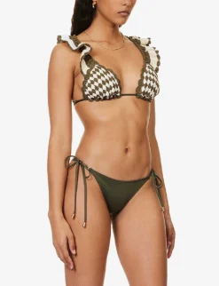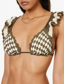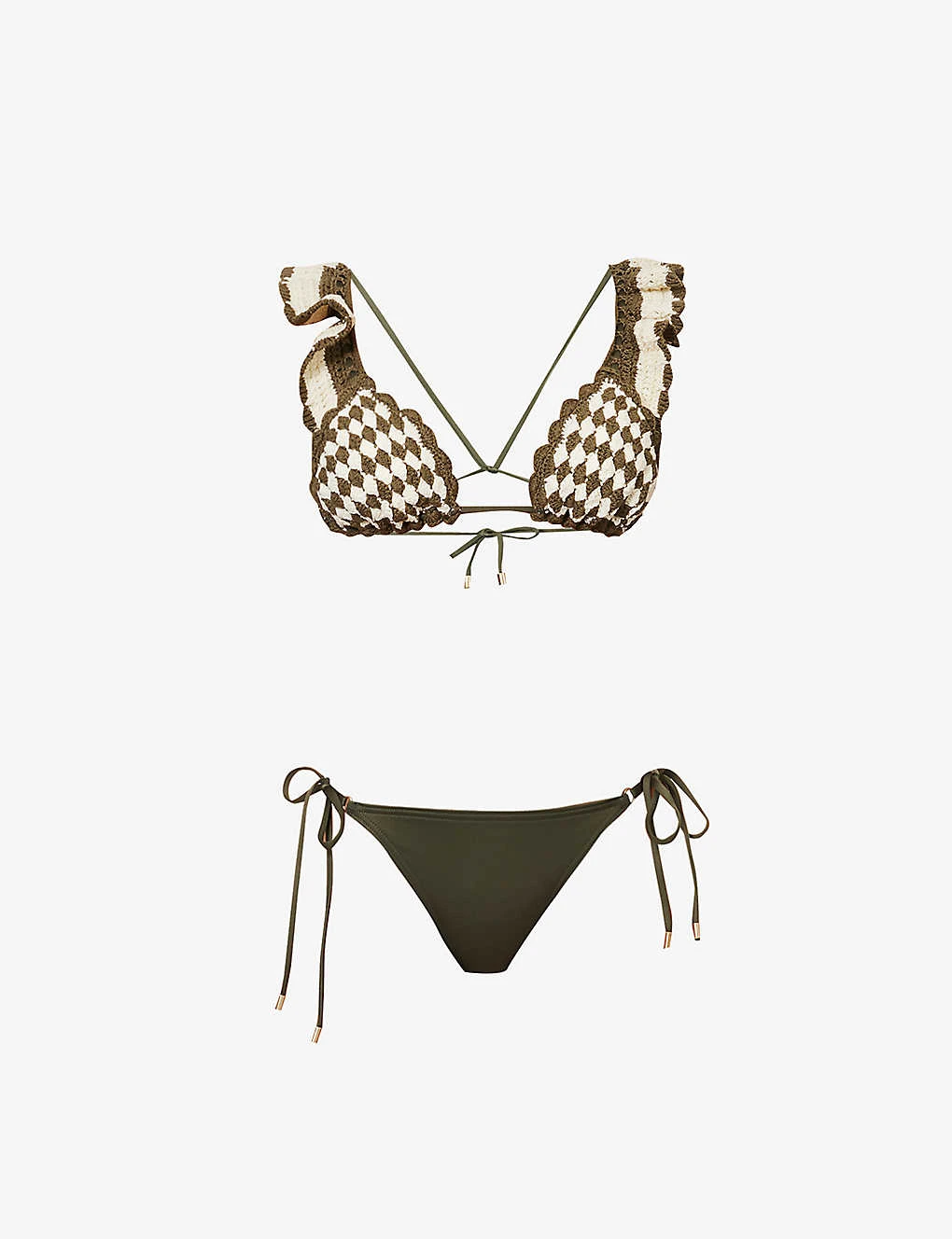 Zimmermann cotton bikini set100% cotton; contrast 80% polyamide, 20% elastaneSelf-tie fasteningTop:Adjustable straps, triangle cups, frilled cap sleeves at shoulders, all-over checkerboard pattern, all-over crochet knit, partially linedBottoms:Adjustable straps, high rise, high leg, medium coverage at back, fully linedHand washTrue to sizeModel is 5ft 9in/1.75m and wears a size smallMidweight, stretchy