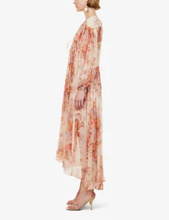 - Regular fit, V-neckline, long sleeves, elasticated sleeve hems, self-tie at waist, floral pattern, flared hem, lined